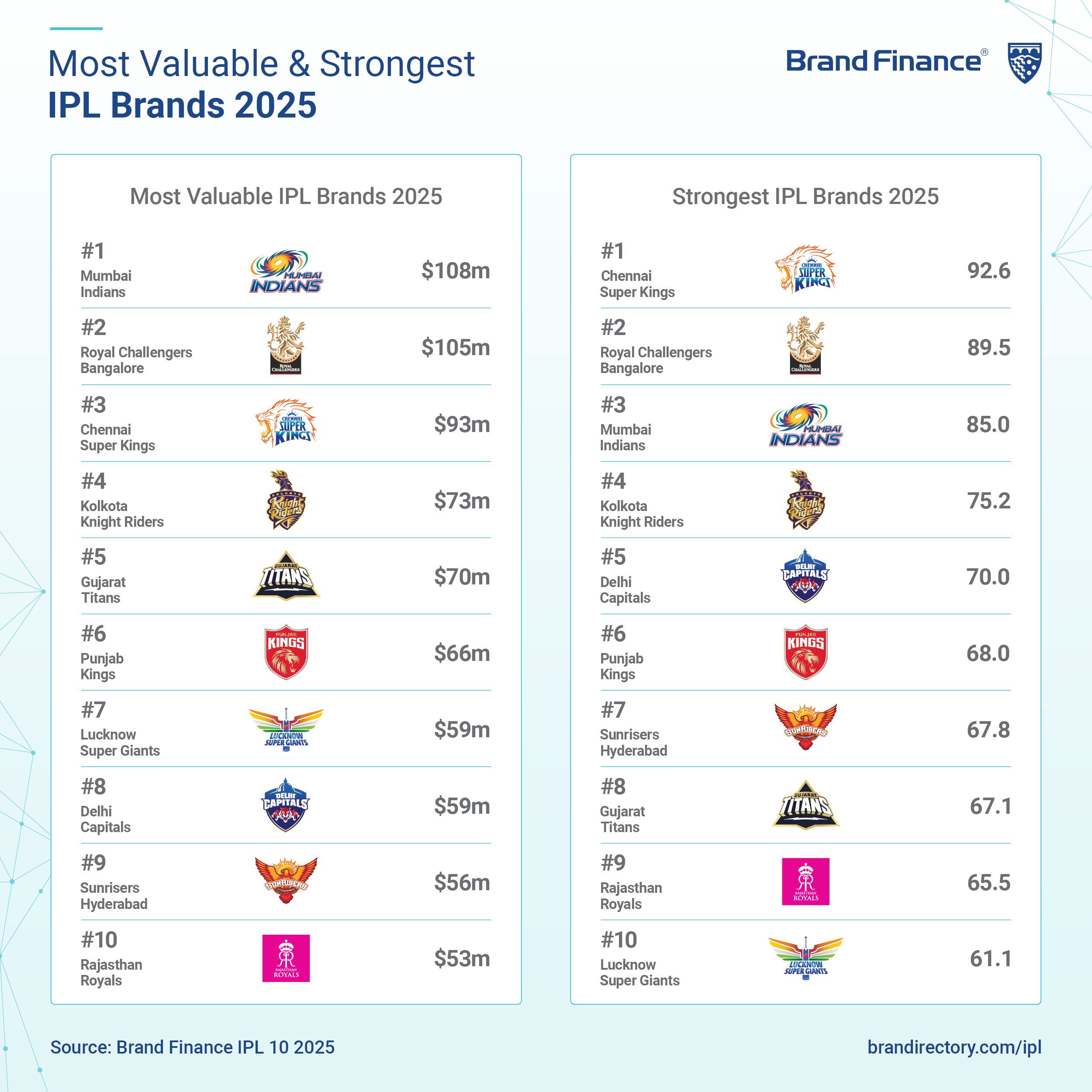 MI emerged as essentially the most precious group model at $108 million and the third strongest with an 85/100 Model Power Index (BSI) rating. Final yr, CSK reigned supreme with $122 million model worth.