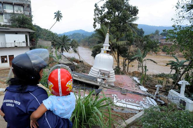 Desolate outlook: Amid the particles of a landslide in Gampola, Kandy, a lady holding a baby observes the harm to a temple.