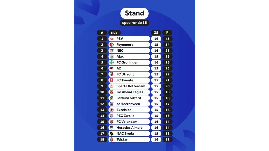 Door de zege vergroot PSV de voorsprong op Feyenoord tot negen punten. De Rotterdammers spelen zondag De Klassieker tegen Ajax in de Johan Cruijff Enviornment.